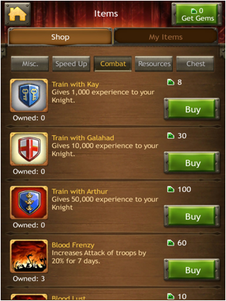 See Figure A. You can purchase the Train withÉ combat items, or you receive them as Merlin and chest gifts. Applying these to a knight can quickly increase its EL. See Figure B.