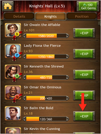 Figure B shows the knights list in my KH. The red arrow points at the button to tap when adding experience to Sir Balin with combat items. When I clicked on the +EXP button, I bought a Train with Kay item. This added 260 experience points, taking Balin from EL-18 to EL-20. The yellow slider next to each knight shows how many experience points he or she needs to reach the next EL. It you donÕt want to purchase gems, and Merlin is stingy with his gifts, each attack adds about 20 EPs. As you can see, it can take awhile to advance to high experience levels using attacksÉ unless of course youÕre Eddie the Farmer. Go get Ôem, Eddie!