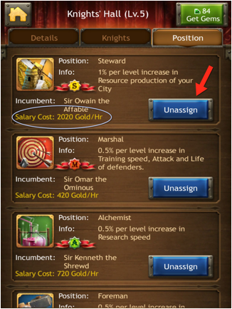 The second cost is in gold, as shown in the circled area in Figure C. As the EP level of the knight assigned to the position increases, so does the salary cost. Compare the costs of Omar and Kenneth to OwainÕs. When you assign knights to positions, be sure your gold production is high enough to maintain payroll. If gold drops to zero, the knights automatically begin unassignment. This is one reason taking gold during farming enemies is a good thing.